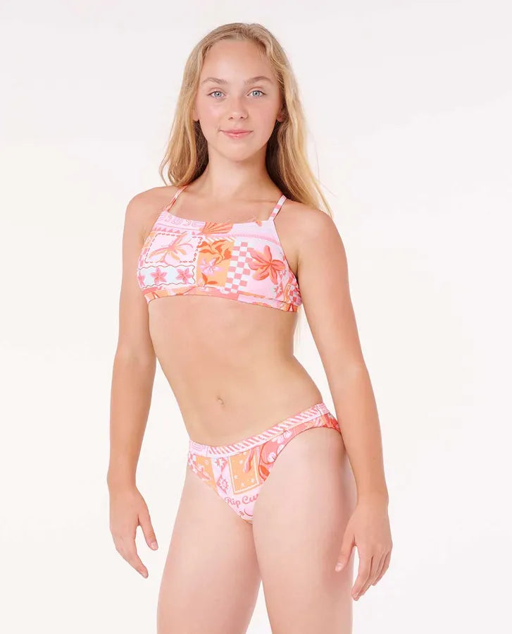 The Paradise Club 3 Piece Set for Girls (aged 8-16 years) has her covered from sand to surf. With a printed rash vest, adjustable bikini straps, and bold yardage print panels, it’s built for mixing, matching, and staying in the water until the sun dips.