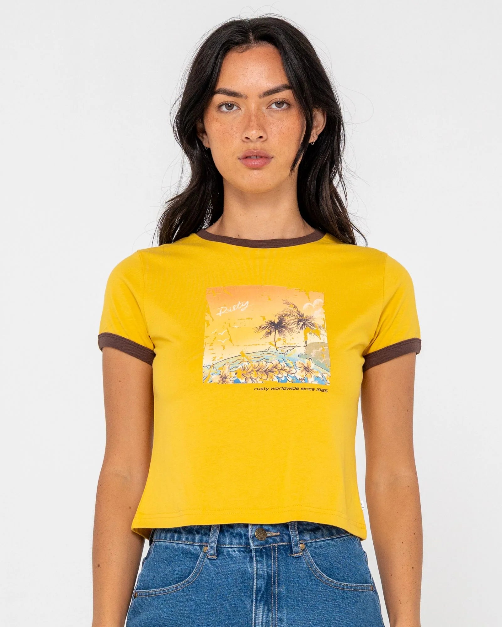 Brighten your day with the Rusty La Cabana Contrast Ringer Mini Tee in Lemon Yellow. This playful slim-fit tee features bold contrast binding and a large screen-printed graphic that pops. Made from 100% cotton mid weight jersey, it offers comfy, breathable wear with a relaxed short sleeve cut perfect for sunny adventures or casual hangouts.