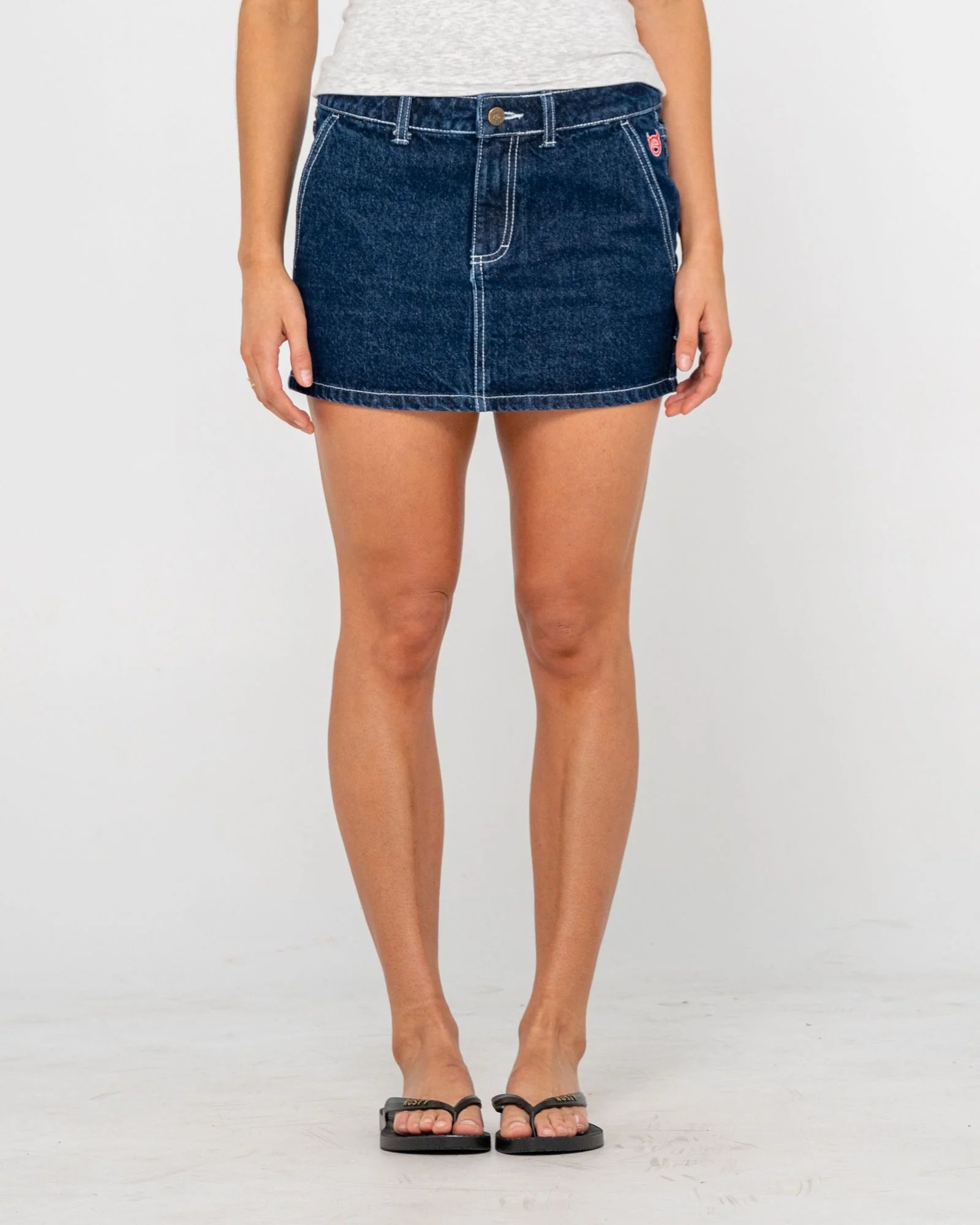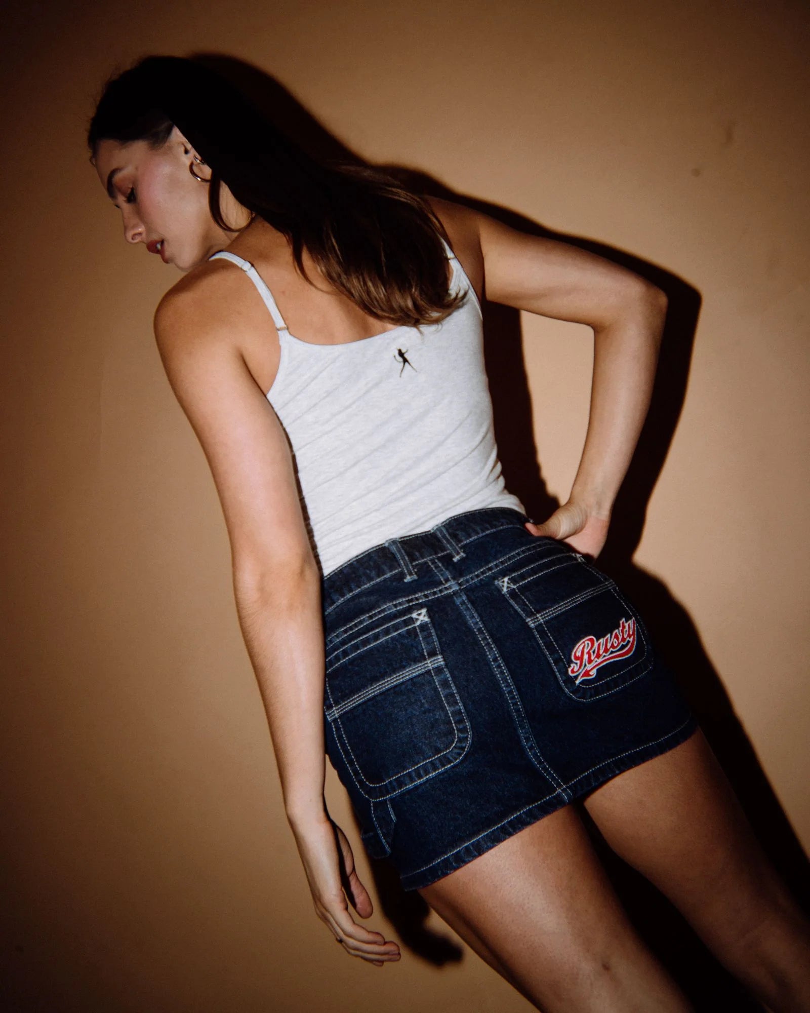 Rusty's Billie Low Rise Denim Mini Skirt brings vintage vibes with a modern edge. Crafted from 100% cotton indigo denim, this mini features a flattering low-rise cut, straight fit, and signature carpenter details paired with embroidered logo accents. Contrast stitching adds visual interest, while the dual zipper and button closure keeps everything secure. Perfect for layering over your favourite tee or pairing with a crop top—a wardrobe essential that works as hard as you do.