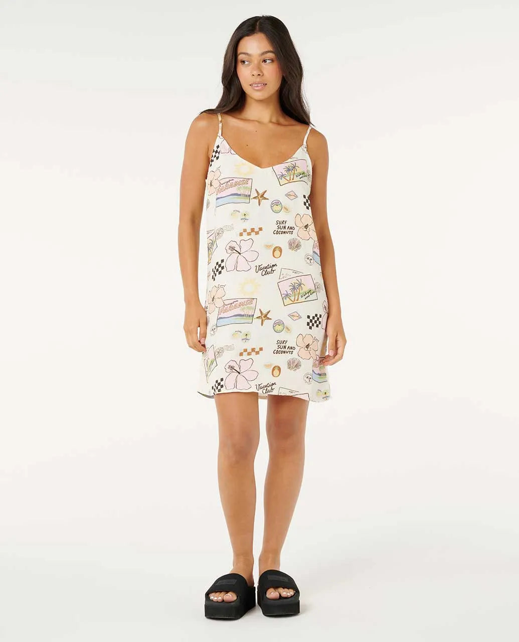 The Sunset Luau Mini Dress is a breezy option with adjustable straps and short sleeves. Made from linen-viscose with an all-over yardage print, it’s finished with a softener wash and metal logo trim.