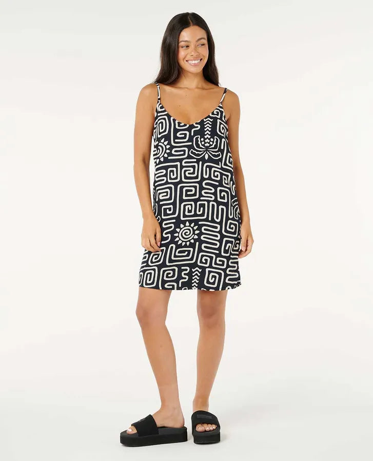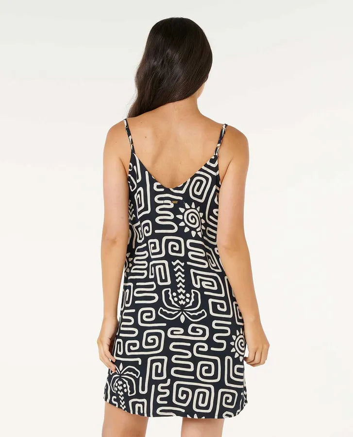 The Sunset Luau Mini Dress is a breezy option with adjustable straps and short sleeves. Made from linen-viscose with an all-over yardage print, it’s finished with a softener wash and metal logo trim.